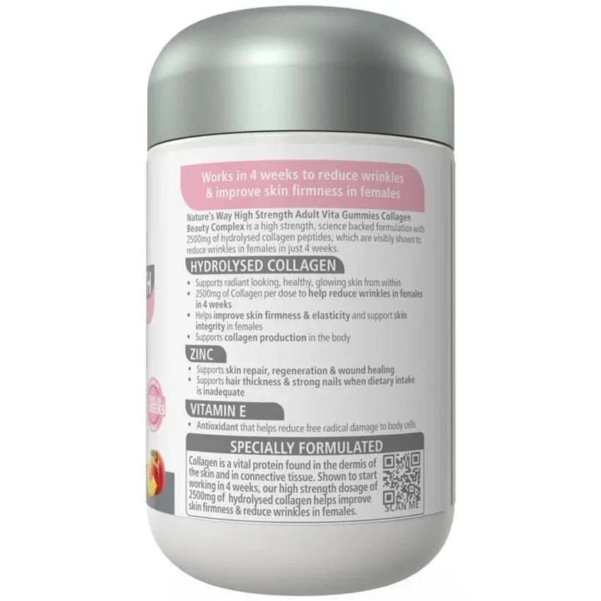 Nature's Way High Strength Adult Vita Gummies Collagen Beauty Complex is a high strength supplement formulated with 2500 mg of hydrolysed collagen per dose to support radiant, glowing and nourished skin.