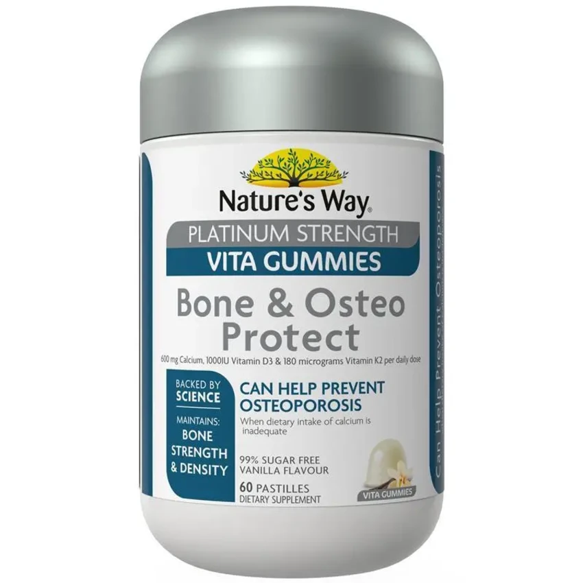 Product Claims: Nature's Way Platinum Strength Vita Gummies Bone & Osteo Protect is backed by science to maintain bone strength, density & can help prevent Osteoporosis when dietary intake of Calcium is inadequate