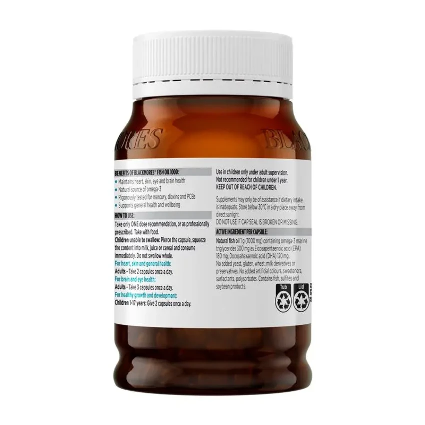 If your diet is low in fish, get the nutrient support you need with Blackmores Fish Oil 1000 capsules. This product provides a high-quality natural source of omega-3 to help maintain the health of your heart, skin, eyes and brain. Blackmores Fish Oil 1000 is extracted from 100% wild caught fish and is ideal if you don’t eat fish two to three times per week. The extraction process ensures purified, high-quality oil that is tested for mercury, dioxins and PCBs. Adults: Take 2 capsules once a day of Blackmores Fish Oil 1000 to support your general health and wellbeing with omega-3.