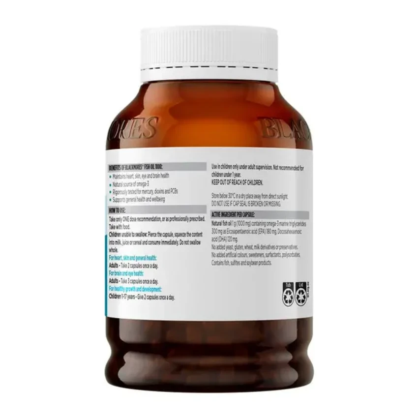 If your diet is low in fish, get the nutrient support you need with Blackmores Fish Oil 1000 capsules. This product provides a high-quality natural source of omega-3 to help maintain the health of your heart, skin, eyes and brain. Blackmores Fish Oil 1000 is extracted from 100% wild caught fish and is ideal if you don’t eat fish two to three times per week. The extraction process ensures purified, high-quality oil that is tested for mercury, dioxins and PCBs. Adults: Take 2 capsules once a day of Blackmores Fish Oil 1000 to support your general health and wellbeing with omega-3.