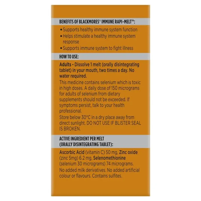 Blackmores Immune Rapi-Melt™ contains vitamin C, zinc and selenium which helps to support the immune system to fight illness and helps to stimulate a healthy immune system response. A great tasting citrus melt that is fast dissolving and dissolves on the tongue, no water required.