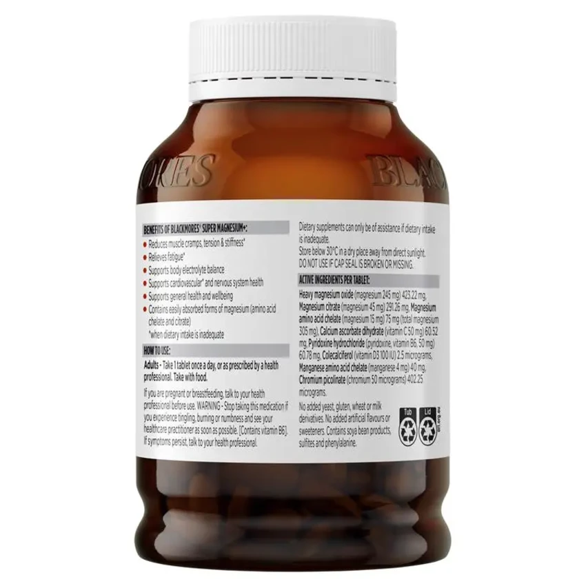 Blackmores Super Magnesium+ contains two easily absorbed forms of magnesium (amino acid chelate and citrate) which help support muscle endurance, reduce muscle cramps, tension and stiffness when dietary intake is inadequate. This high-dose tablet also supports energy levels and body electrolyte balance.