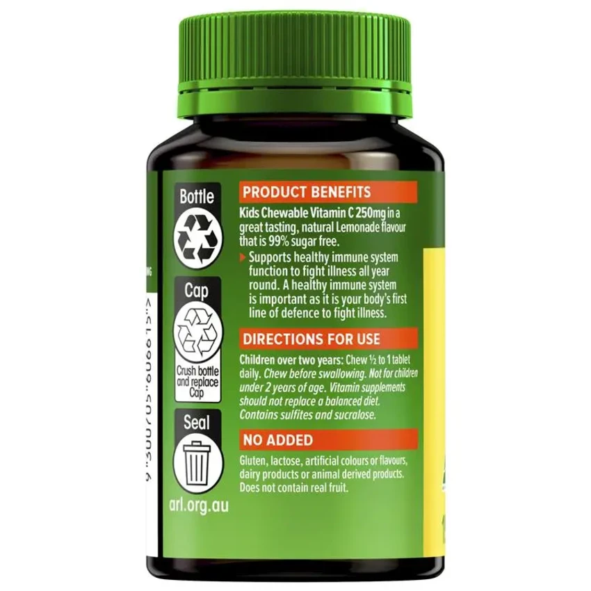 Support your child's healthy immune system function with Cenovis Kids Chewable Vitamin C 250mg. Formulated for kids, this Vitamin C supplement delivers antioxidants that help reduce free-radicals formed in the body. Cenovis Kids Chewable Vitamin C 250mg also helps your child to maintain healthy gums. Additionally, the Lemonade-flavoured chewable tablet is easy to take, and helps prevent vitamin C deficiency in children. Children over 2 years: chew ½ to 1 tablet daily. Chew before swallowing. Not for children under 2 years of age. Proudly Australian Made® from Cenovis, trusted by Australian families for over 80 years, Cenovis Kids Chewable Vitamin C Tablets are quality tested during manufacturing to ensure product consistency and potency. Cenovis Kids Chewable Vitamin C Tablets contain no added gluten, lactose, artificial colours or flavours, dairy products, or animal-derived products*. Vitamin supplements should not replace a balanced diet. If symptoms persist, consult your healthcare professional.