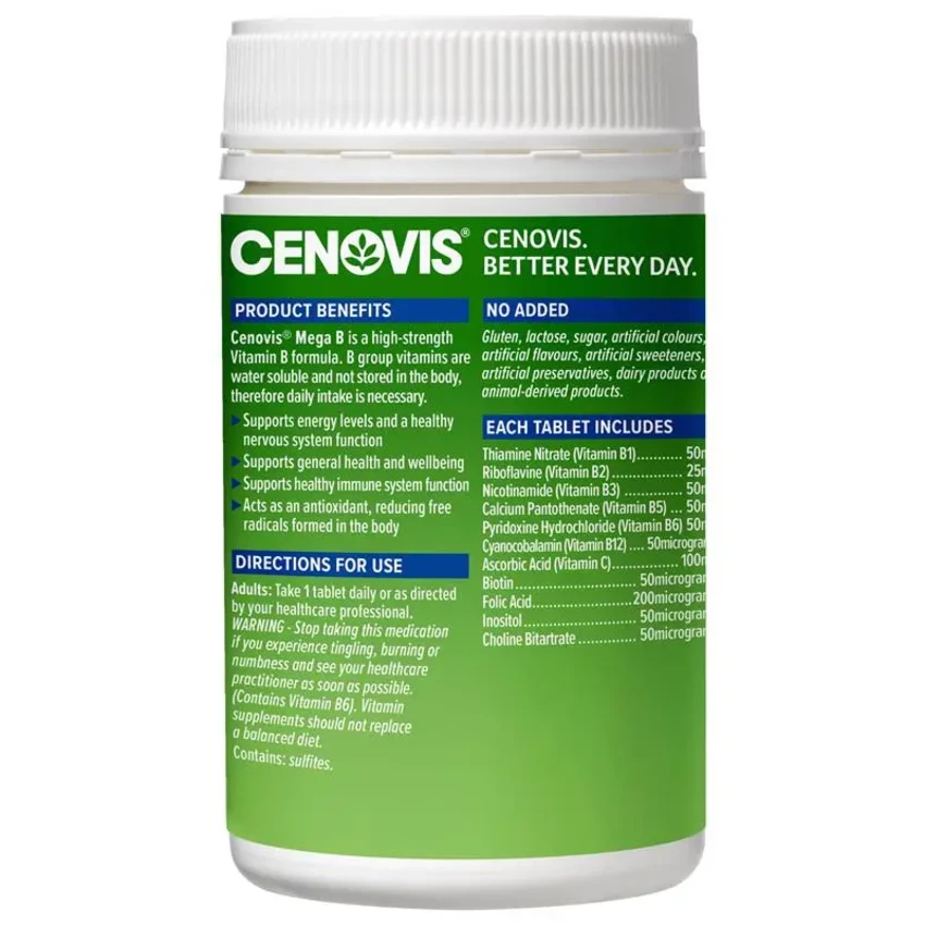 Support your body's energy levels, general health and wellbeing with Cenovis Mega B tablets. When taken daily, this high-strength Vitamin B formula* also supports and maintains healthy nervous and immune system function and acts as an antioxidant to reduce the formation of free radicals in the body. Proudly Australian Made® by Cenovis, trusted by Australian families for over 80 years, Cenovis Mega B tablets contain no added gluten, lactose, sugar, artificial colours, artificial flavours, artificial sweeteners, dairy products or animal-derived products.** Adults 19 years and over, take 1 tablet daily or as recommended by your healthcare professional. Warning: Stop taking this medication if you experience tingling, burning or numbness and see your healthcare practitioner as soon as possible (contains Vitamin B6). Vitamin supplements should not replace a balanced diet.
