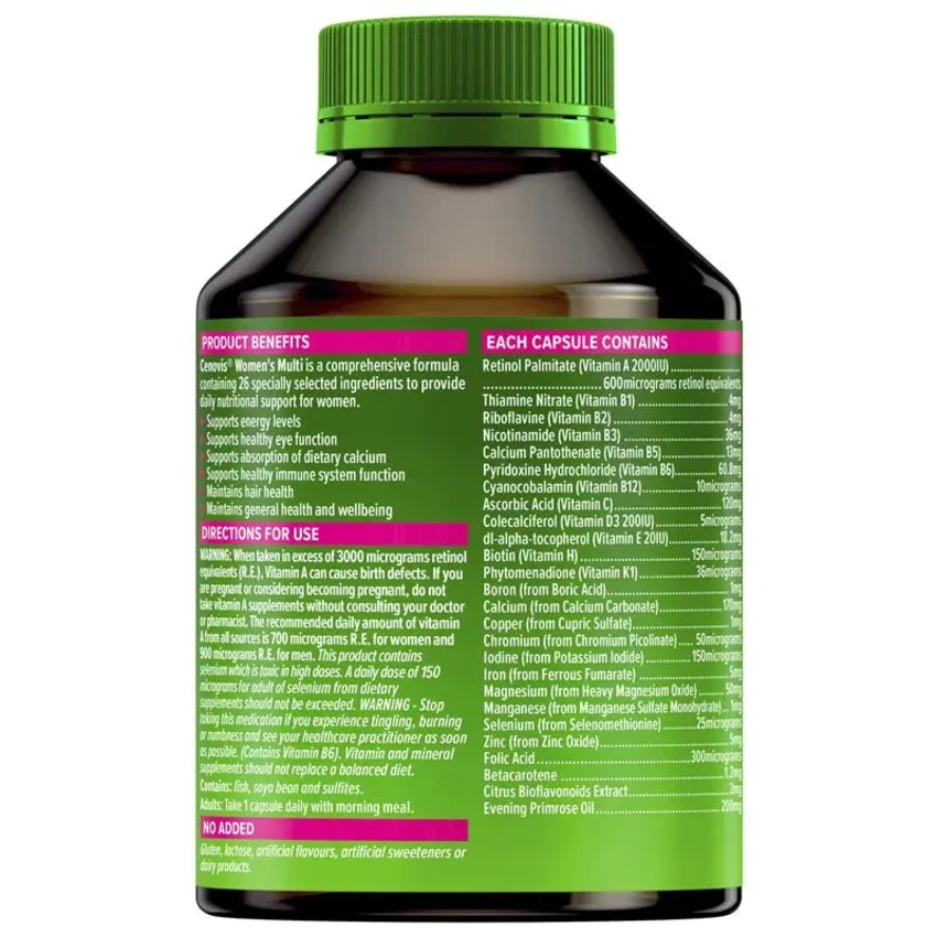 Maintain your energy levels, general health, and wellbeing with Cenovis Women's Multi Capsules 100. Each once daily multivitamin capsule for women contains a comprehensive formula of 26 specially selected ingredients to support your body's production of energy and maintain energy levels, as well as support absorption of dietary calcium and healthy immune system function. When taken as a daily nutritional supplement, Cenovis Women's Multi capsules support healthy eye function and hair health. Proudly Australian Made® by Cenovis, trusted by Australian families for over 80 years, Cenovis Women's Multi daily nutritional multivitamin contains no added gluten, lactose, artificial flavours, artificial sweeteners or dairy products*. Adults 19 years and older, take 1 capsule daily with a morning meal or as advised by your healthcare professional.**