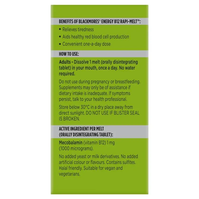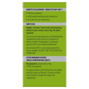 Blackmores Energy B12 Rapi-Melt™ contains 1000 mcg of B12, at a convenient one-a-day dose. A great tasting melt which rapidly dissolves on the tongue, with no water required, while also providing support to your vitamin B12 intake and daily energy production.