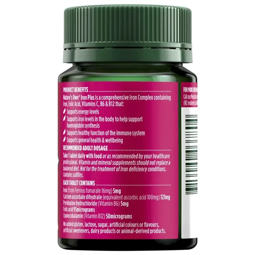 Nature's Own Iron Plus is a comprehensive Iron Complex containing Iron, Folic Acid, Vitamins C, B6 & B12.