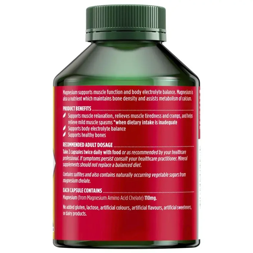 Help relieve mild muscle spasms and muscle cramps with Nature’s Own Magnesium Chelate 500mg capsules. Each capsule provides 110mg of Magnesium (from Magnesium Amino Acid Chelate), which helps the body maintain electrolyte balance, supports muscle function and relaxation, and also relieves muscle tiredness, helps relieve mild muscle spasms and muscle cramps when dietary intake is inadequate. In addition, Magnesium supports bone health, maintains bone density, and assists metabolism of calcium. Australian Made® and rigorously tested to ensure quality, potency, and purity, Nature’s Own Magnesium Chelate 500mg tablets contain no added gluten, lactose, artificial colours, artificial flavours, artificial sweeteners, or dairy products.* Adults: Take 2 capsules twice daily with food or as recommended by your healthcare professional. If symptoms persist consult your healthcare practitioner. Mineral supplements should not replace a balanced diet. Always read the label and follow the directions for use.