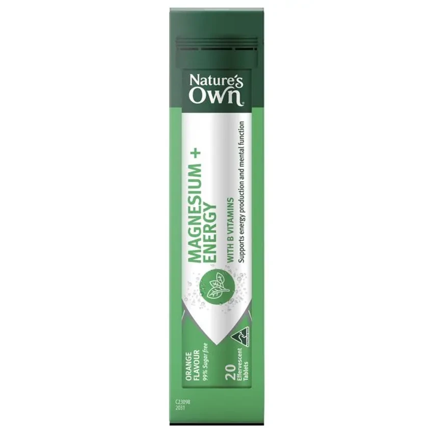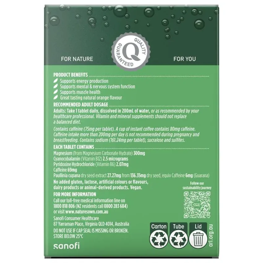 Support your body's energy production and mental function with Nature’s Own Magnesium + Energy Tablets. Each tablet contains a blend of Magnesium, Vitamin B6, Vitamin B12, Caffeine *, and Paullinia cupana dry seed extract. Magnesium + Energy supports energy production, as well supports healthy mental and nervous system function. This 1-a-day Magnesium, B Vitamin, Guarana and caffeine supplement also supports healthy immune system function, and maintains muscle health. Australian Made® and rigorously tested to ensure quality, potency, and purity, Nature’s Own High Strength Magnesium tablets contain no added gluten, lactose, artificial colours or flavours, dairy products or animal derived products *. Adults take one tablet once daily dissolved in 200mL of water, or as directed by your healthcare professional, for an effervescent, natural orange-flavoured drink that tastes great. Always read the label and follow the directions for use.