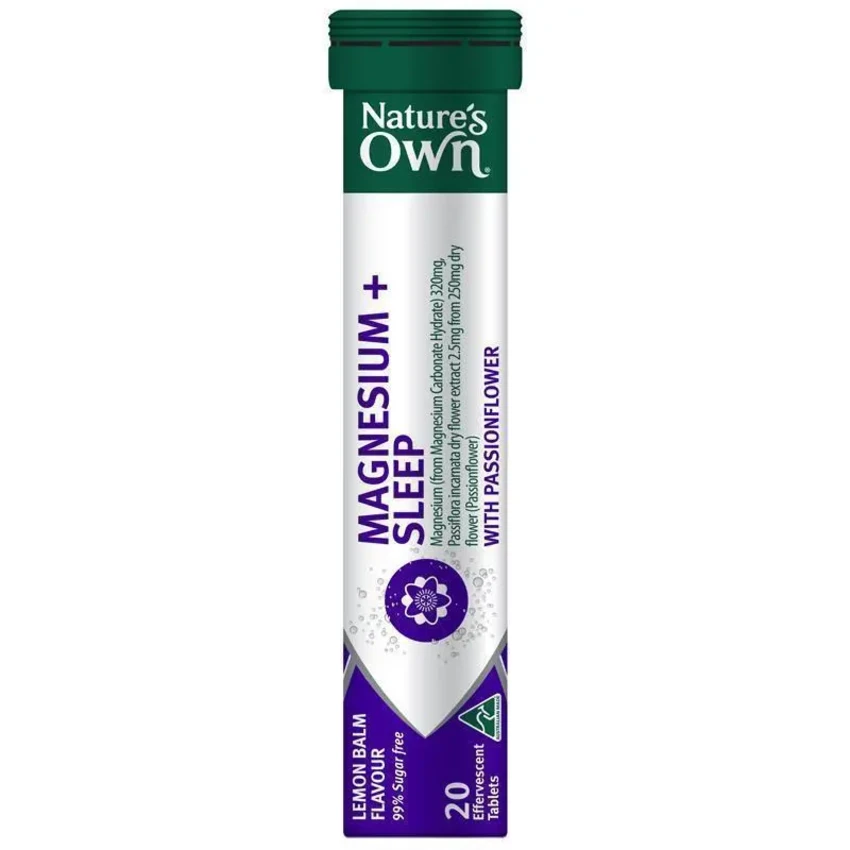 Having trouble falling asleep because of stress? Nature’s Own Magnesium + Sleep Tablets is convenient 1-a-day magnesium supplement which dissolves easily in water for an effervescent lemon balm flavoured drink that tastes great. Each tablet is specially formulated with 320mg Magnesium (from Magnesium Carbonate Hydrate) and 2.5mg Passionflower extract (from 250mg dry flower) and is traditionally used in Western herbal medicine to relieve sleeplessness associated with stress and decrease feelings of restlessness. This mineral and herbal supplement also helps relieve muscle cramps when dietary intake of magnesium is inadequate. Adults take one tablet daily, dissolved in 200mL of water, or as recommended by your healthcare professional, for a lemon balm-flavoured effervescent drink that tastes great. If symptoms persist, see your healthcare professional. Always read the label and follow the directions for use. Australian Made®, and rigorously tested to ensure quality, potency, and purity, Nature’s Own Magnesium + Sleep Tablets are 99% sugar free and contain no added gluten, lactose, artificial colours, artificial flavours, dairy products, or animal-derived products*.