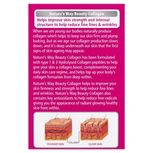 Your beauty cream works from the top down, but Nature's Way Beauty Collagen tablets are different - it works from within, nourishing where creams can't reach. Nature's Way Beauty Collagen helps promote collagen formation which gives integrity to internal skin structures and also helps women enhance skin firmness, elasticity and overall skin health.