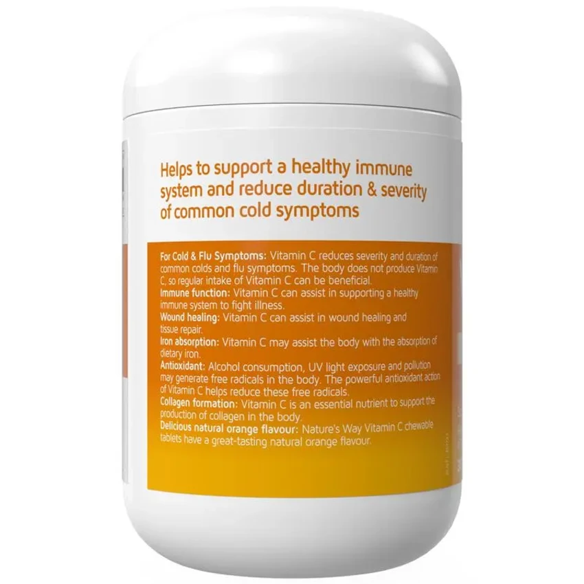 Nature's Way Vitamin C 500mg Sugarless is a Vitamin C formula in a convenient chewable tablet with a delicious natural orange flavour. Helps to support a healthy immune system and reduce duration & severity of common cold symptoms.