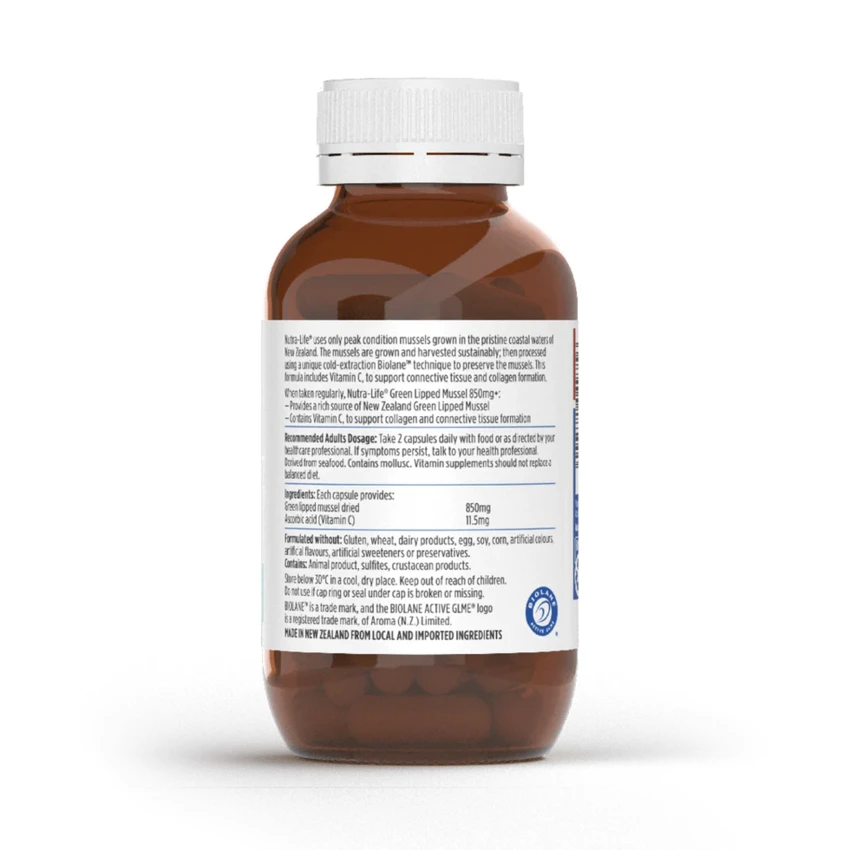 Nutra-Life® uses only peak condition mussels grown in the pristine coastal waters of New Zealand. The mussels are grown and harvested sustainably; then processed using a unique cold-extraction Biolane™ technique to preserve the mussels. This formula includes Vitamin C, to support connective tissue and collagen formation.