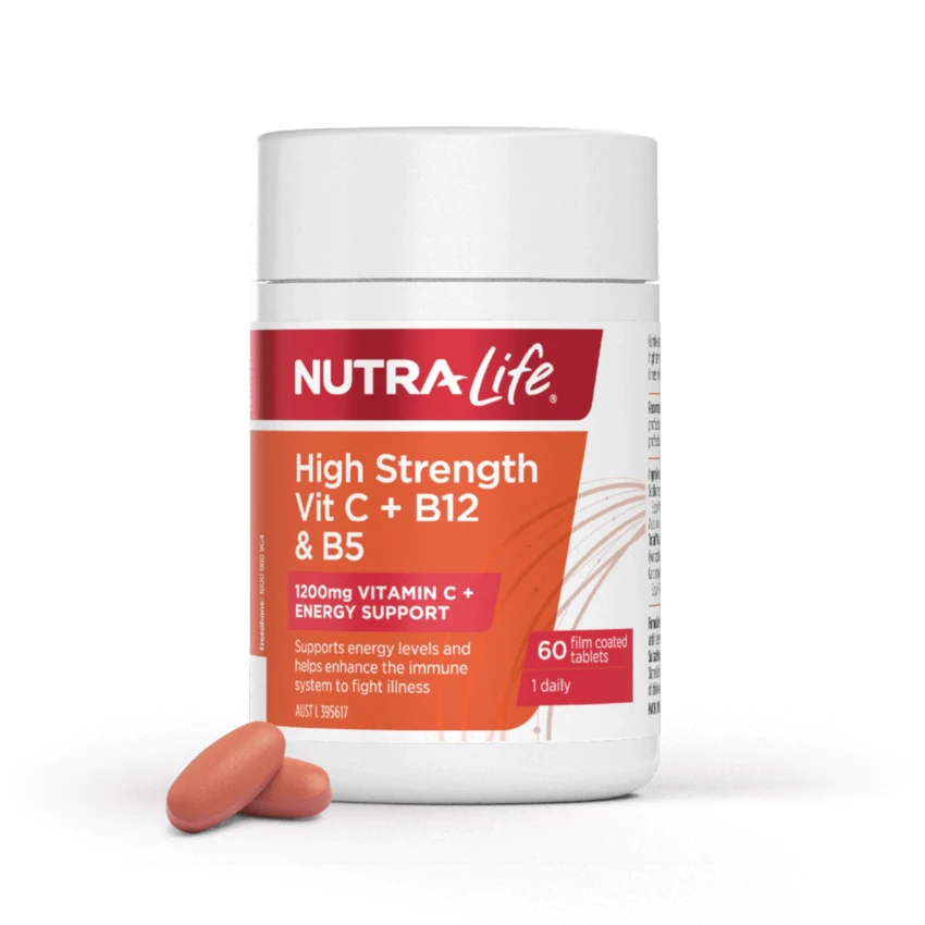 Nutra-Life High Strength Vit C + B12 & B5 combines a high strength 1200mg dose of Vitamin C with Vitamin B12 & Vitamin B5.