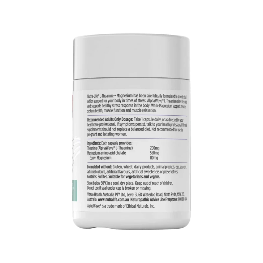 Nutra-Life® L-Theanine + Magnesium has been scientifically formulated to provide dual action support for your body in times of stress. AlphaWave® L-Theanine calms the mind and supports healthy stress response in the body. While Magnesium supports nervous system health, muscle function and muscle relaxation.