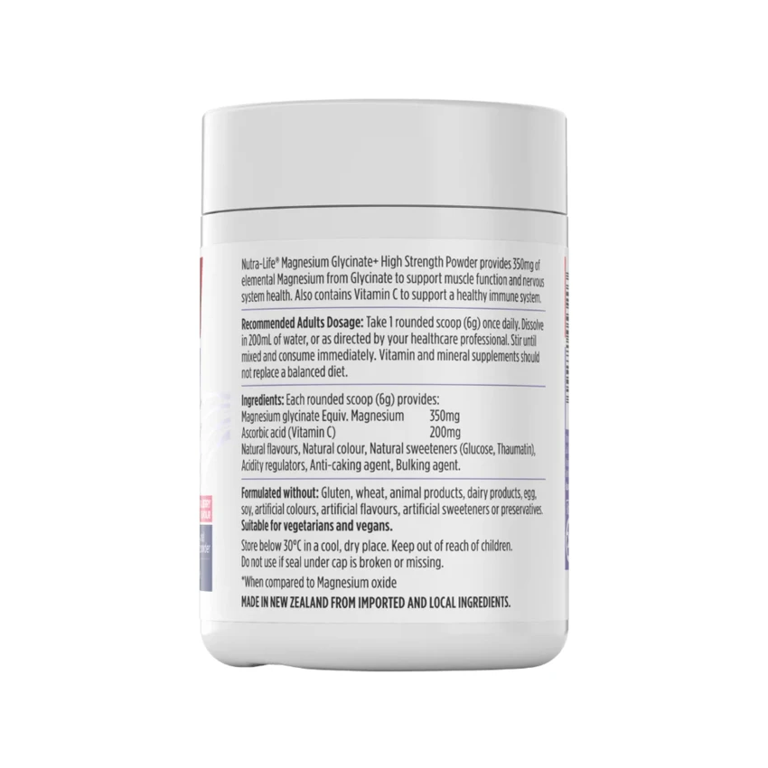 Nutra-Life® Magnesium Glycinate+ High Strength Powder provides 350mg of elemental Magnesium from Glycinate to help reduce muscle cramps and mild spasms when dietary intake is inadequate. It also supports muscle relaxation, muscle function and nervous system function. Also contains Vitamin C to support a healthy immune system. *When compared to Magnesium oxide