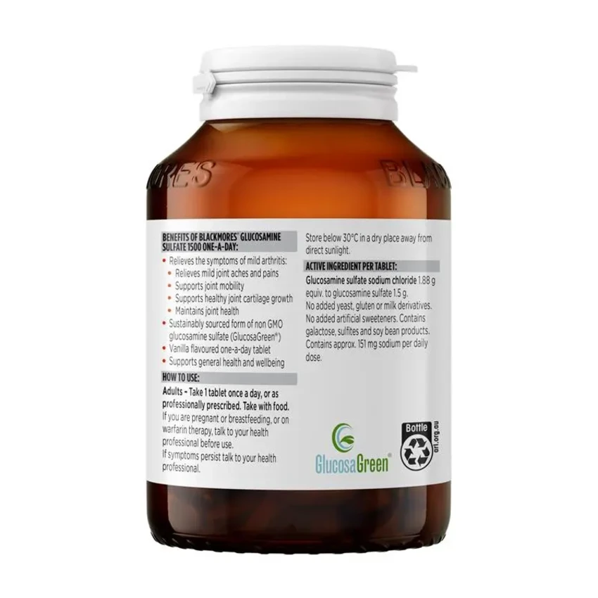 Blackmores Glucosamine Sulfate 1500 One-A-Day is a vanilla flavoured, one a day dose of sustainably sourced form of non GMO glucosamine sulfate (GlucosaGreen®). It relieves the symptoms of mild arthritis including mild joint aches and pains, helps maintain joint mobility, supports healthy joint cartilage growth and maintains joint health.