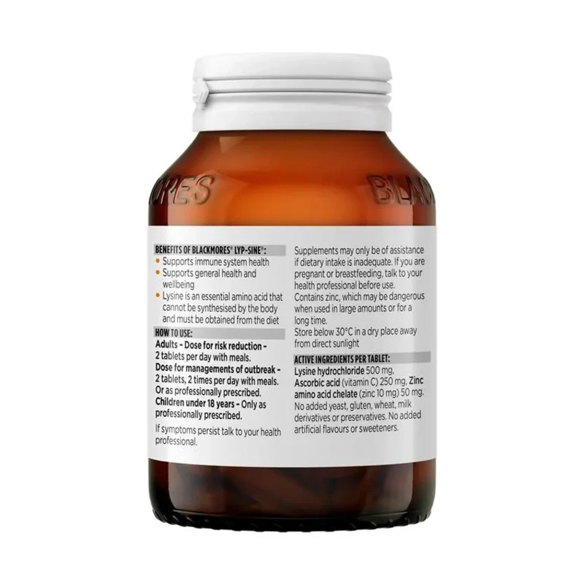 Reduce the symptoms of cold sores with Blackmores Lyp-sine® tablets. This product is formulated to relieve the symptoms of facial cold sores and support immune system health. Blackmores Lyp-sine® is a combination formula including vitamin C and zinc which supports wound healing. It also contains lysine, an essential amino acid that cannot be synthesised by the body and must be obtained from the diet. Adults: Dose for risk reduction - 2 tablets per day or for management of outbreak - 2 tablets, 2 times per day.