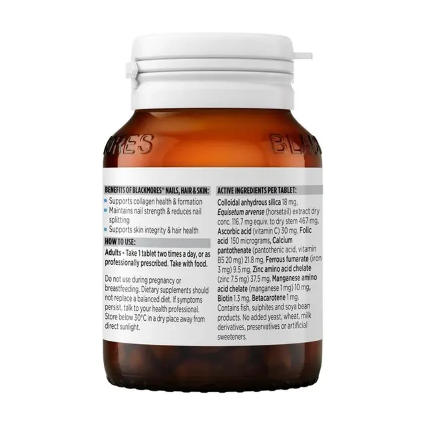 Blackmores Nails, Hair & Skin is a comprehensive formula that provides essential nutrients for healthy nails, hair and skin. It supports collagen formation and reduces nail brittleness & splitting.