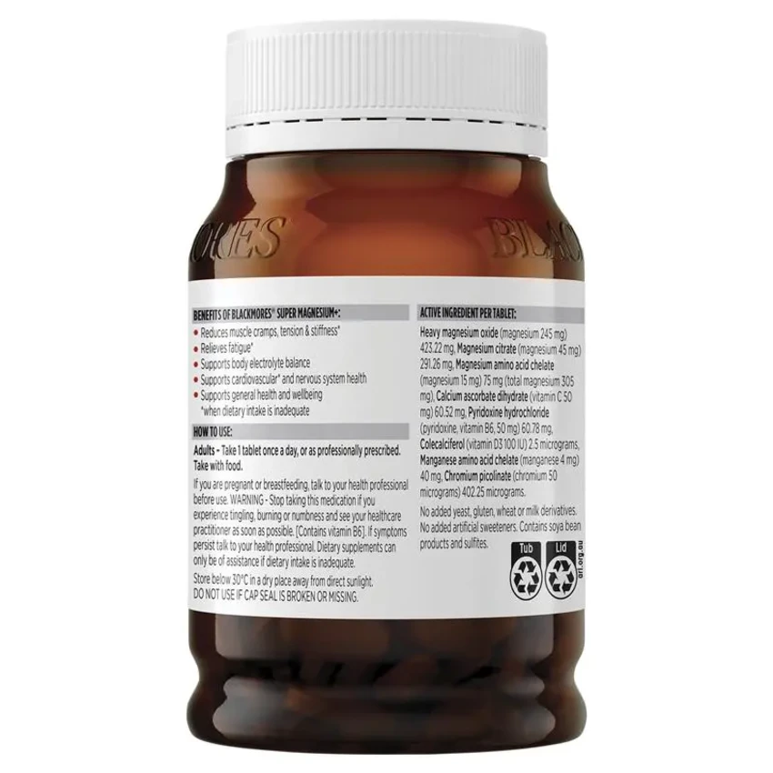 Blackmores Super Magnesium+ contains two easily absorbed forms of magnesium (amino acid chelate and citrate) which help support muscle endurance, and reduce muscle cramps, tension and stiffness when dietary intake is inadequate. This high-dose tablet also supports energy levels and body electrolyte balance.