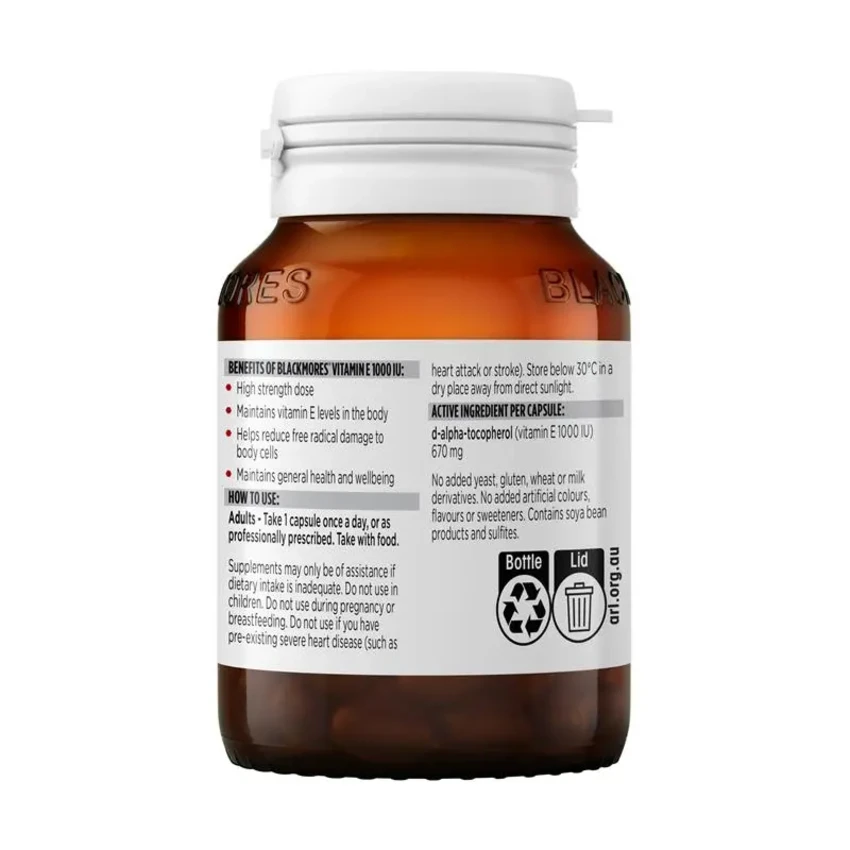 Maintain your heart's health with Blackmores Vitamin E 1000 IU. These capsules contain a one-a-day dose of vitamin E, to help maintain cholesterol, blood lipid, and blood vessel health.