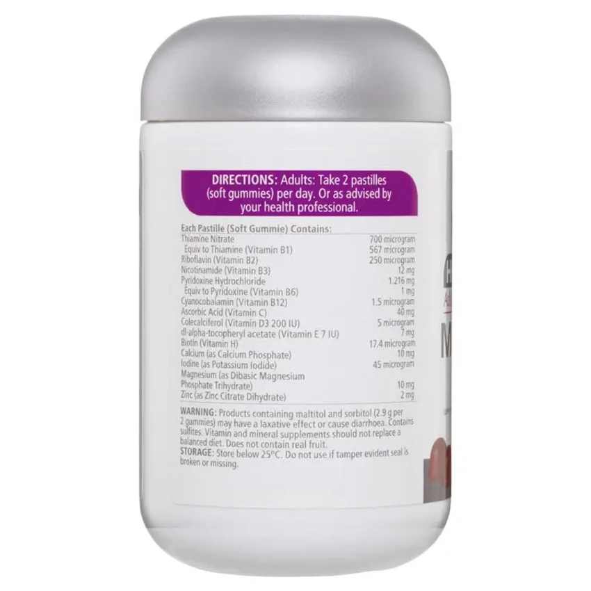 Always read the label and follow directions for use. Products containing maltitol and sorbitol (2.9 g per 2 gummies) may have a laxative effect or cause diarrhoea. Contains sulfites. Vitamin and mineral supplements should not replace a balanced diet.