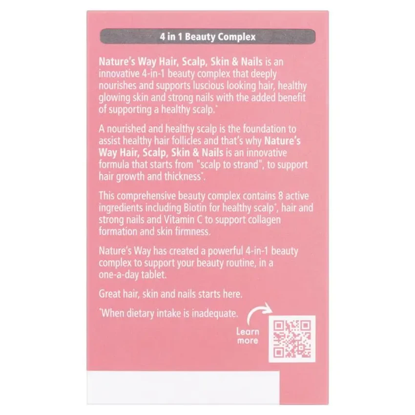 Nature's Way Hair, Scalp, Skin & Nails is an innovative 4-in-1 beauty complex that deeply nourishes and supports luscious looking hair, healthy glowing skin and strong nails with the added benefit of supporting a healthy scalp.*