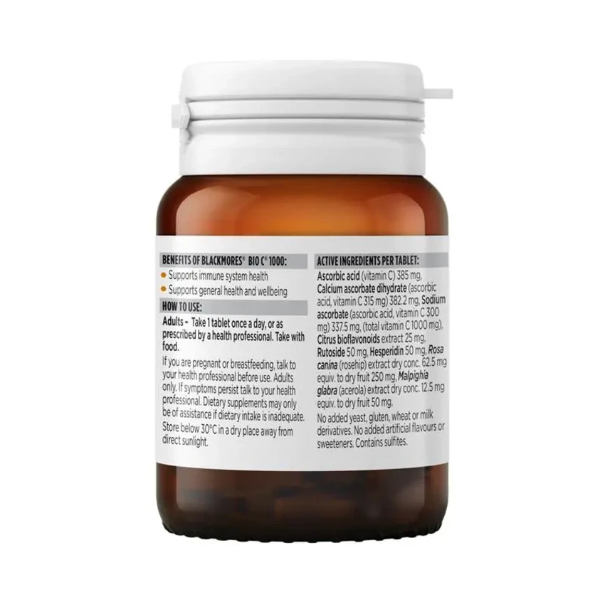 Blackmores Bio C® 1000 gives you a boost of vitamin C to reduce the severity and duration of common cold symptoms and support immune system health. It is a high potency formula that comes in a convenient one-a-day tablet for every day health.This formula is buffered with mineral ascorbates to give you a vitamin C that’s gentle on the stomach and has added bioflavonoids thought to support the efficacy of vitamin C.