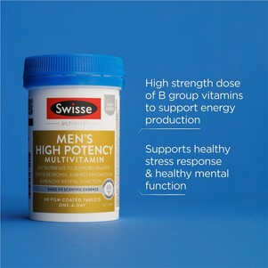 When you need to be at your best every day, consider Swisse Ultivite Men's High Potency Multivitamin to help give you a nutritional boost to achieve your goals. This premium quality men’s multivitamin contains a high strength dose of B group vitamins to support energy production and vitality, and is specifically tailored for those with busy, active lifestyles. Available in a convenient, daily tablet, it’s formulated with 30 vitamins, minerals, antioxidants, and herbs - including zinc, biotin, vitamin D3, and selenium - to support general health and wellbeing, and to help fill nutritional gaps when dietary intake is inadequate.