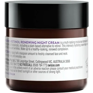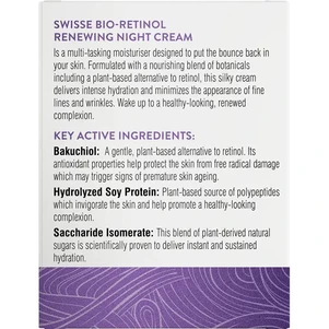 Refresh your skin with Swisse Skincare Bio-Retinol Renewing Night Cream. Contains bakuchiol, shea butter, and moringa seed oil, it hydrates and smooths, targeting the appearance of fine lines for a naturally softer, more radiant-looking complexion. Ideal for vegans and vegetarians seeking a gentle skincare solution.