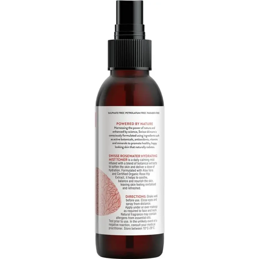 Experience the beauty of nature with Swisse Rosewater Hydrating Mist Toner. This exquisite toner is suitable for normal to dry skin and crafted with certified organic rose hip extract, aloe vera, and rose flower oil. It hydrates and conditions the skin, leaving it soft and nourished. The toner's versatility allows it to be used both under and over makeup, providing a refreshing mist. With 98.8% naturally derived ingredients, it's suitable for vegans and vegetarians, making it a conscientious choice for your skincare regimen.