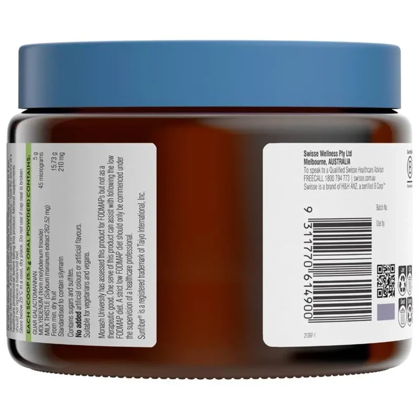 Revitalise your gut health with Swisse Ultibiotic Daily + Detox Prebiotic Fibre. Featuring Guar galactomannan, Sunfiber® [partially hydrolysed Guar Gum (PHGG)] —an unflavoured prebiotic fiber that maintains bowel regularity, helps enhance digestion system health and supports beneficial intestinal flora. Enriched with Molybdenum to support healthy liver function and Milk Thistle to support natural liver detoxification processes. Swisse Ultibiotic Daily Detox + Prebiotic Fibre is designed to deliver tailored benefits.