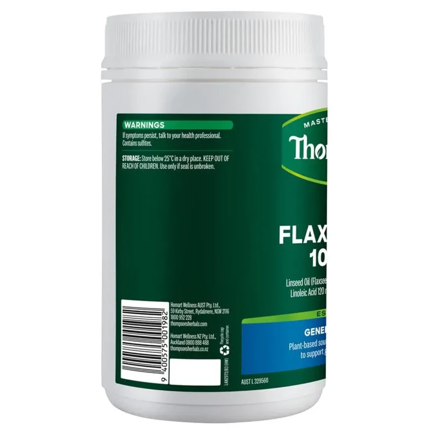 Thompson's Flaxseed Oil 1000MG is a plant-based source of Omega 3, 6 & 9 fatty acids to support general health & skin health.