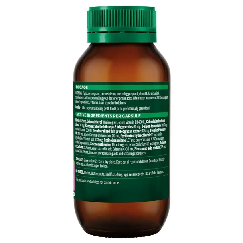 silica 30 mg, Concentrated fish Omega-3 triglycerides 60 mg, d-alpha-tocopherol 20.12 mg, equiv. Vitamin E 30 IU, Demineralised fish proteoglycan extract 125 mg, Evening Primrose Oil 200 mg, equiv. Gamma-linolenic acid 20 mg, Pyridoxine hydrochloride 10 mg, equiv. Pyridoxine (Vitamin B6) 8.23 mg, Retinol palmitate 1.37 mg, equiv. Vitamin A 750 microgram