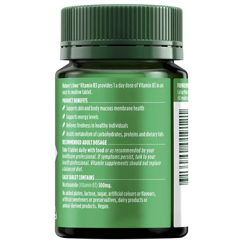 Support skin health and maintain energy levels with Nature's Own Vitamin B3 500mg tablets. Our easy-to-swallow supplement provides 500 milligrams of nicotinamide (vitamin B3), to help support your body in metabolising carbohydrates, proteins and dietary fats. In addition, Nature's Own Vitamin B3 500mg tablets also relieve tiredness in healthy individuals and support body mucous membrane health. Nature's Own Vitamin B3 500mg tablets also maintain Vitamin B3 within the normal range. Australian Made® and rigorously tested to ensure quality, potency, and purity, Nature's Own Vitamin B3 500mg tablets contain no added gluten, lactose, sugar, artificial colours, artificial flavours, artificial sweeteners, artificial preservatives, dairy products or animal-derived products. Adults, take 1 tablet daily with food or as recommended by your healthcare professional. Always read and follow the directions for use.