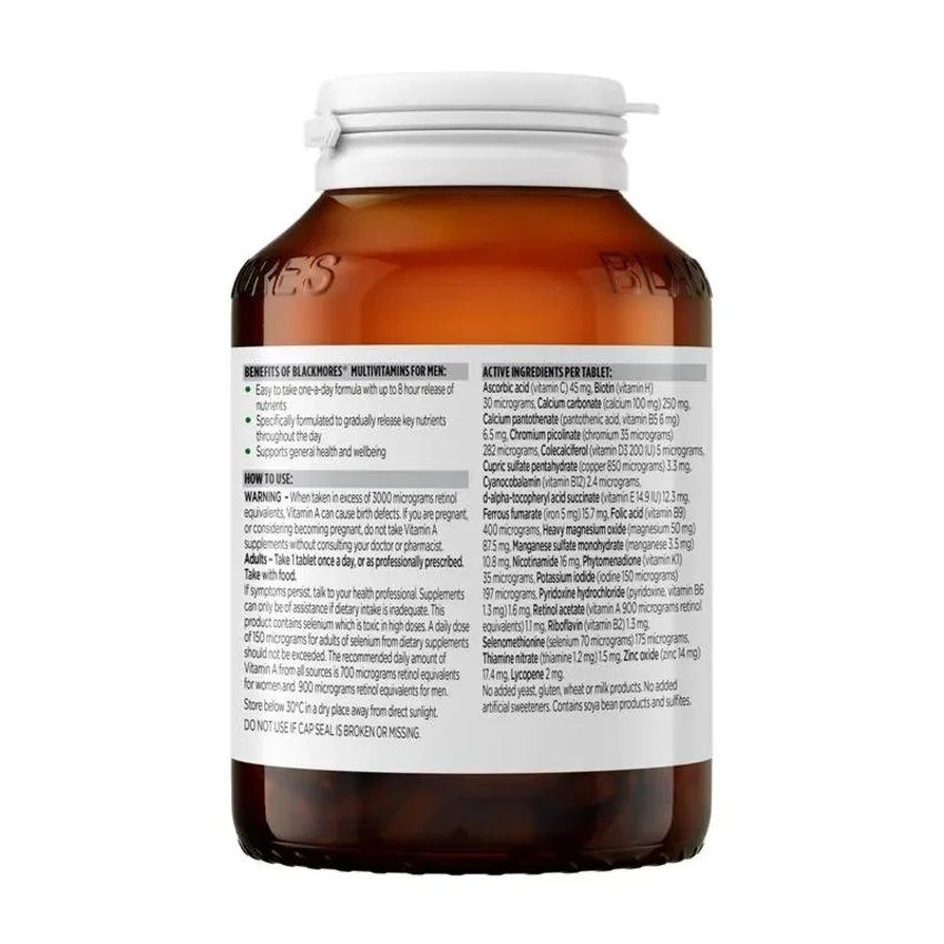 Take care of your general health and wellbeing with Blackmores Multivitamin for Men. These tablets help maintain your testosterone levels and mental performance. This comprehensive blend of 21 ingredients is formulated to help convert food to energy to help you take on the day. This formula is designed to support your everyday health, with tribulus to help support male sexual performance, and zinc to support your immunity and post-exercise recovery. It also includes milk thistle help maintain a healthy liver. Adults: Take one tablet, once daily.