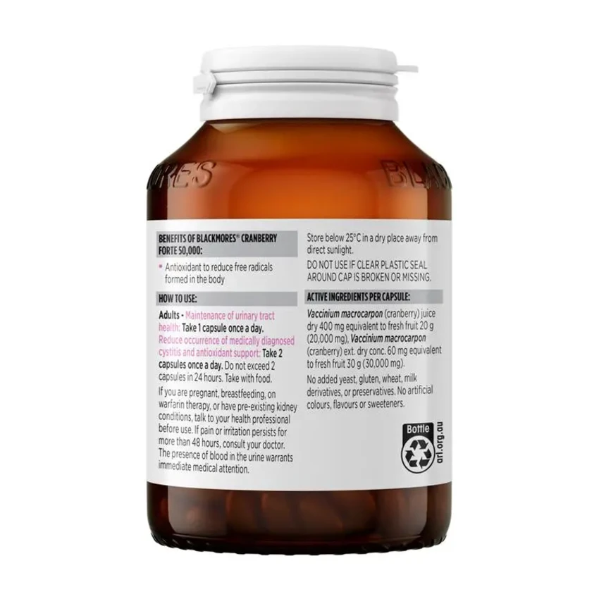 Help reduce the occurrence of medically diagnosed cystitis with Blackmores Cranberry Forte 50,000 capsules. This dietary supplement is a concentrated cranberry extract to support urinary tract health.