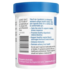 This 5-In-1 probiotic powerhouse is tailored to target women's unique health needs in just one daily capsule. Inner Health Women's 5-in-1 Probiotic is formulated to calm the mind and support a healthy stress response whilst offering healthy digestive function and regularity, reducing bloating and pain, for 24-hour gut support. This unique formulation also contains B12 and folate to maintain energy levels. Researched probiotic strains strengthen your immune system response whilst supporting urogenital health by maintaining healthy vaginal flora and pH, as well as supporting oestrogen hormone levels. BETTER HEALTH STARTS WITH INNER HEALTH