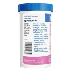 This 5-In-1 probiotic powerhouse is tailored to target women's unique health needs in just one daily capsule. Inner Health Women's 5-in-1 Probiotic is formulated to calm the mind and support a healthy stress response whilst offering healthy digestive function and regularity, reducing bloating and pain, for 24-hour gut support. This unique formulation also contains B12 and folate to maintain energy levels. Researched probiotic strains strengthen your immune system response whilst supporting urogenital health by maintaining healthy vaginal flora and pH, as well as supporting oestrogen hormone levels. BETTER HEALTH STARTS WITH INNER HEALTH