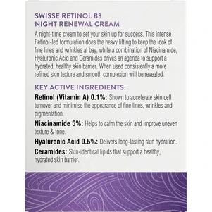 Unlock the secrets of youthful skin with Swisse Retinol B3 Night Renewal Cream. This cream is formulated with niacinamide to improve uneven texture and tone and retinol Vitamin A, to minimise the appearance of fine lines, wrinkles and pigmentation. This luxurious product contains hyaluronic acid which delivers long lasting skin hydration while ceramides support a healthy hydrated skin barrier. Revel in a smooth complexion when used consistently, thanks to Swisse’s scientifically evidenced formula.