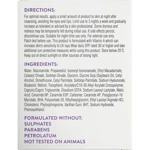 Patch test before use. This product is formulated with Vitamin A which can increase skin's sensitivity to UV rays. Wear daily SPF rated 30 or higher and take additional sun-protective measures while using this product.